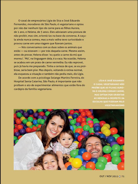 Quando eu nasci, minha mãe teve muita dificuldade em amamentar-me e por falta de um melhor preparo, na época, perdeu a paciência de seguir tentando e partiu logo para o leite de vaca. Naquele momento, ainda recém nascida dei os primeiros sinais de intolerância alimentar, mas como imaginaram que era tão somente com o leite, substituiram pelo leite de soja e assim fui crescendo. Até os seis meses, como só tomava leite de soja não tive maiores problemas assim que os médicos assumiram que o problema já estava solucionado. Quando, no entanto, comecei a alimentar-me de outras coisas além do leite de soja, os problemas (que mais adiante comento quais eram) recomeçaram, em pequena escala, mas sempre presentes. Mas como os médicos examinavam e examinavam e não encontravam a raiz do problema fui crescendo e acostumando-me a sentir-me mal, achando, inclusive que era normal. Tipo "Ah! Alguma coisa que comi não me fez bem". E tome remédio para dentro... Antiácidos, antifebris, antibióticos... Todos os "anti" conhecidos, que aliviavam por alguns dias, para logo voltarem os sintomas. Por ser filha de pai diabético, apesar da má alimentação/nutrição, fui uma criança pré-obesa, o que só complicava minha situação. Meu pai era carnívoro feroz, daqueles que gostava de comer a carne, como dizem, ainda com "o boi berrando"... Adorava todos os tipos de carne e os comia em demasia, era do tipo de pessoa que, embora tenha sido um ser humano muito bom com os demais, não era consigo mesmo, pois preferia remediar a prevenir e, infelizmente isto o levou à morte... Hoje entendo que meu pai não faleceu por culpa da diabetes, na realidade ele se suicidou dia após dia, bem lentamente e em algum momento seus órgãos já não suportaram e quando eu tinha 9 anos ele veio a falecer. Com a morte de meu pai minha mãe (que gostava muito do que era natural, embora não tivesse maiores conhecimentos do assunto) começou a mudar um pouco nossa alimentação. Já não comíamos tantas carnes (leia-se qualquer tipo) e começamos a comer mais frutas e verduras. Com esta mudança minha saúde deu um melhorada, mas eu ainda sentia o mesmo de antes, com menos frequência, mas sentia. O tempo foi passando e como eu já vivia acostumada com minha condição, achei que estava muito bem... Até que tinha 14 pra 15 anos, quando os sintomas se agravaram de tal forma que eu tive que ser hospitalizada. O que eu sentia, desde recém nascida, em diferentes graus de intensidade e frequência era: náusea, vômitos, enxaquecas, febre alta, e os dois piores sintomas - alternância de uma prisão de ventre que podia deixar-me até 45 dias (isso mesmo... 45 dias) sem ir ao banheiro, com diarréia que me levava à beira da desidratação; além de hemorragia quase diária, pelo ânus. Mas há quem pergunte "e com tantos sintomas por que não procurou um médico, uma urgência?"... Fiz isso quase que semanalmente durante os primeiros 15 anos de minha vida... "mas uma prisão de ventre de 45 dias? E por que não tomava laxante?"... Tomava, e fazia lavagem e os médicos não entendiam porque saía o remédio, a substância para lavagem, mas as fezes continuavam cimentadas nas paredes do intestino... Isso foi assim até que eu fui hospitalizada e entrei em coma. Minha mãe se desesperou por pensar em perder a filha aos 15 anos e com uma mini cirurgia os médicos conseguiram retirar a matéria apodrecida do meu corpo, o que me fez sair do coma. Assim que pude voltar a casa minha mãe tomou a decisão que salvou a minha vida (naquela época os médicos me deram 6 meses de vida)... Ela pensou que já que eu ia morrer mesmo, ia procurar uma última ajuda, a de um médico naturalista... Lembro-me como se fosse hoje, quando entrei no consultório do médico ele me olhou e já foi logo dizendo o que eu tinha que fazer: "Durante 15 dias você vai retirar de sua alimentação todo e qualquer alimento de origem animal... Com isso sei que se irá curar... Não me volte aqui antes dos 15 dias... Daqui pra lá, se não melhorar, começamos a pensar em algo mais radical (o que afinal eu nunca soube o que seria)"... Ele me deu uma lista de todos os alimentos que eu deveria eliminar definitivamente de minha alimentação, incluindo os que, naquela época, eu sequer imaginava ser de origem animal, exemplo de gelatinas, marias mole, etc, etc... No mesmo dia em que o médico me recomendou tirar tudo de origem animal da minha dieta já comecei com ela e o primeiro que percebi foi o desaparecimento da febre e ao final do terceiro dia foram-se as náuseas, os vômitos e ao quinto dia o intestino começou a funcionar diariamente sem o mínimo traço de sangue e/ou hemorragia... Ao final dos 15 dias voltei e o médico disse que eu nasci com a ausência de uma enzima que tem a capacidade de processar a proteína animal e este era o motivo de todos os meus problemas desde o nascimento. De lá pra cá (e já se vão quase 30 anos) não consumo nada, absolutamente nada que seja de origem animal, mas não foi até meus 25-28 anos que soube que, na alimentação eu era considerada vegana e foi então que ao estudar sobre o veganismo conheci o outro lado: o filosófico, de amor e respeito a toda forma de vida animal no planeta... Aos 21 anos fui mãe do meu primeiro filho e já o criei no veganismo, permitindo que, além de ser um ser humano melhor, ele fosse também, um ser saudável. Aos 35 me casei com um lacto-vegetariano, que embora respeitasse muito aos animais, ainda não sabia, ao certo, como fazê-lo da forma mais correta... Aprendeu comigo e imediatamente se tornou igualmente vegano. Aos 36 nasceu minha segunda filha (a dona do prato que eu publiquei ontem... Hehehehe), a qual vem sendo criada no veganismo, com a exceção única do leite materno, alimentação exclusiva até os seis meses de vida (e complementar até os 3 anos e meio). Há anos só vamos ao médico por questões únicas de pequenos acidentes, que ninguém está livre e re
