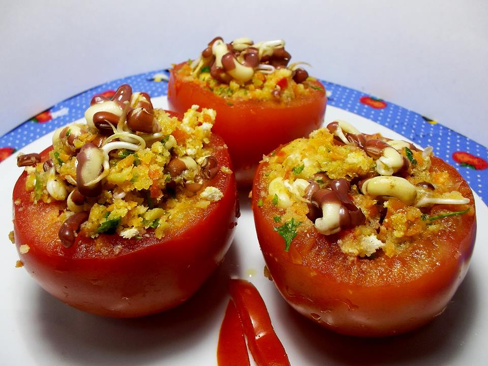 Misture todos os ingredientes e recheie os tomates